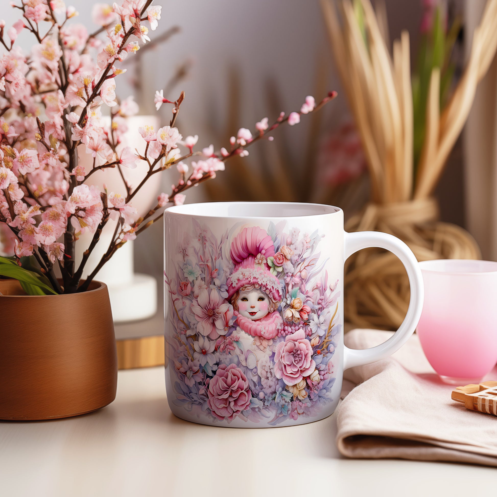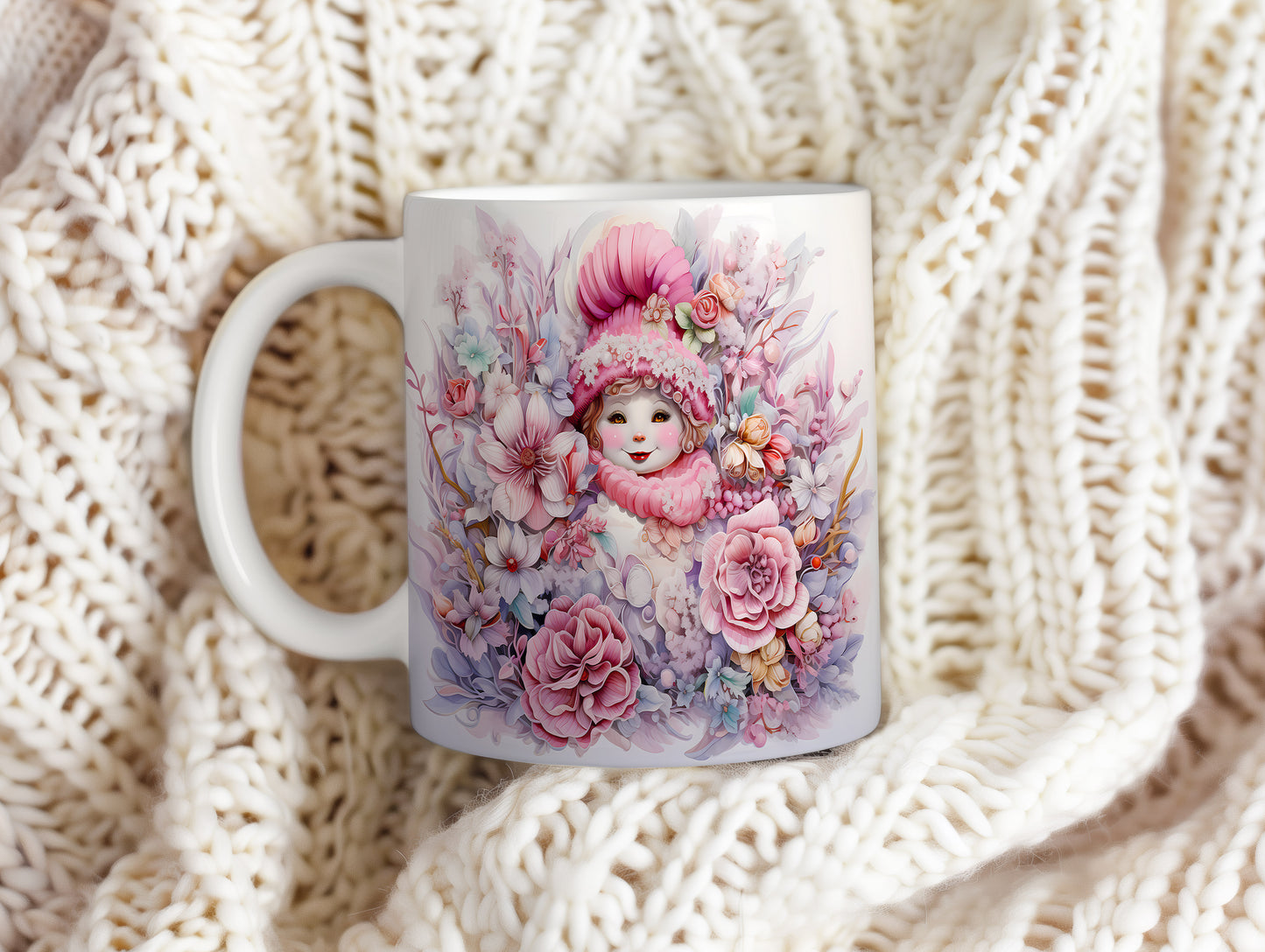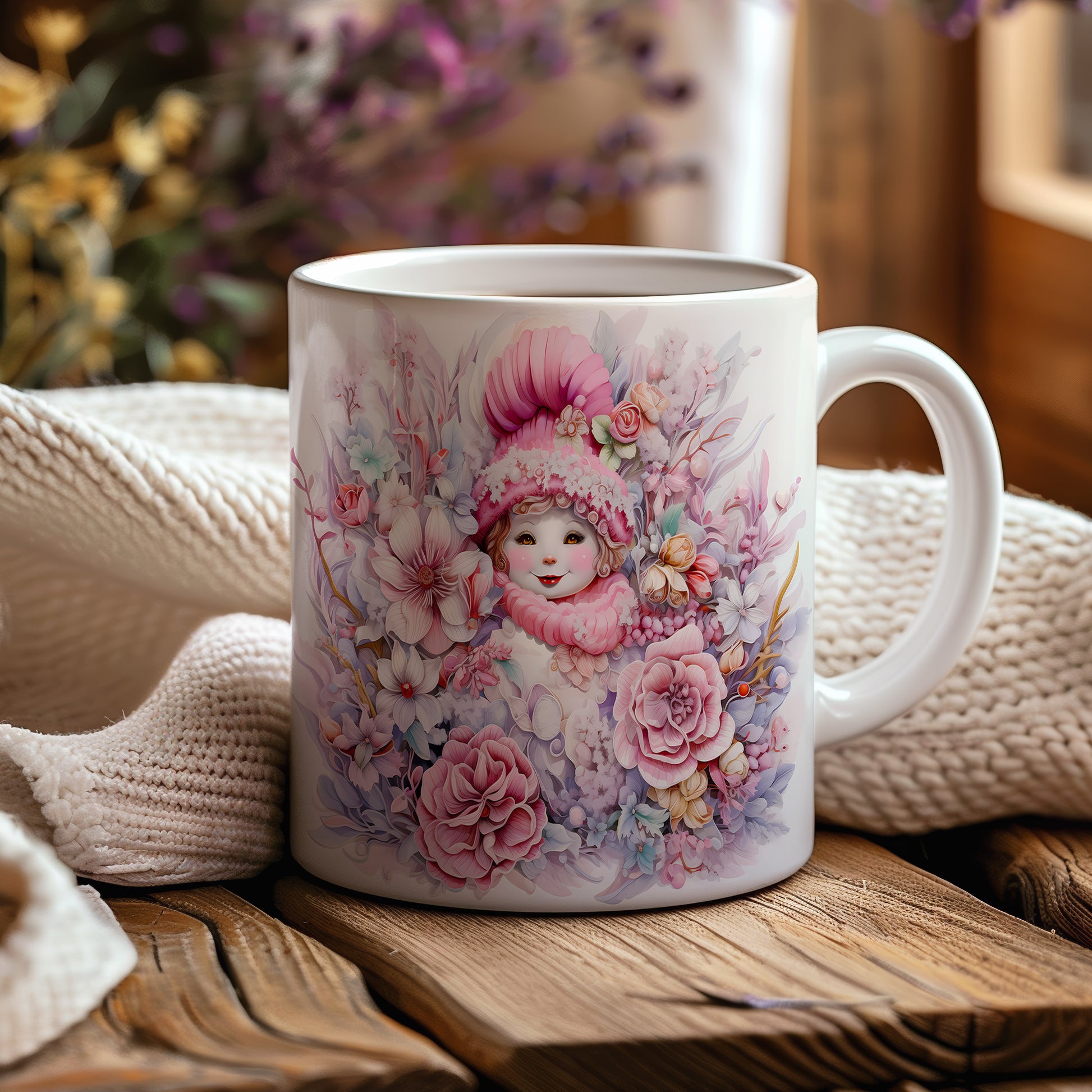 Vánoční hrnek s dětská tvářem a květinami