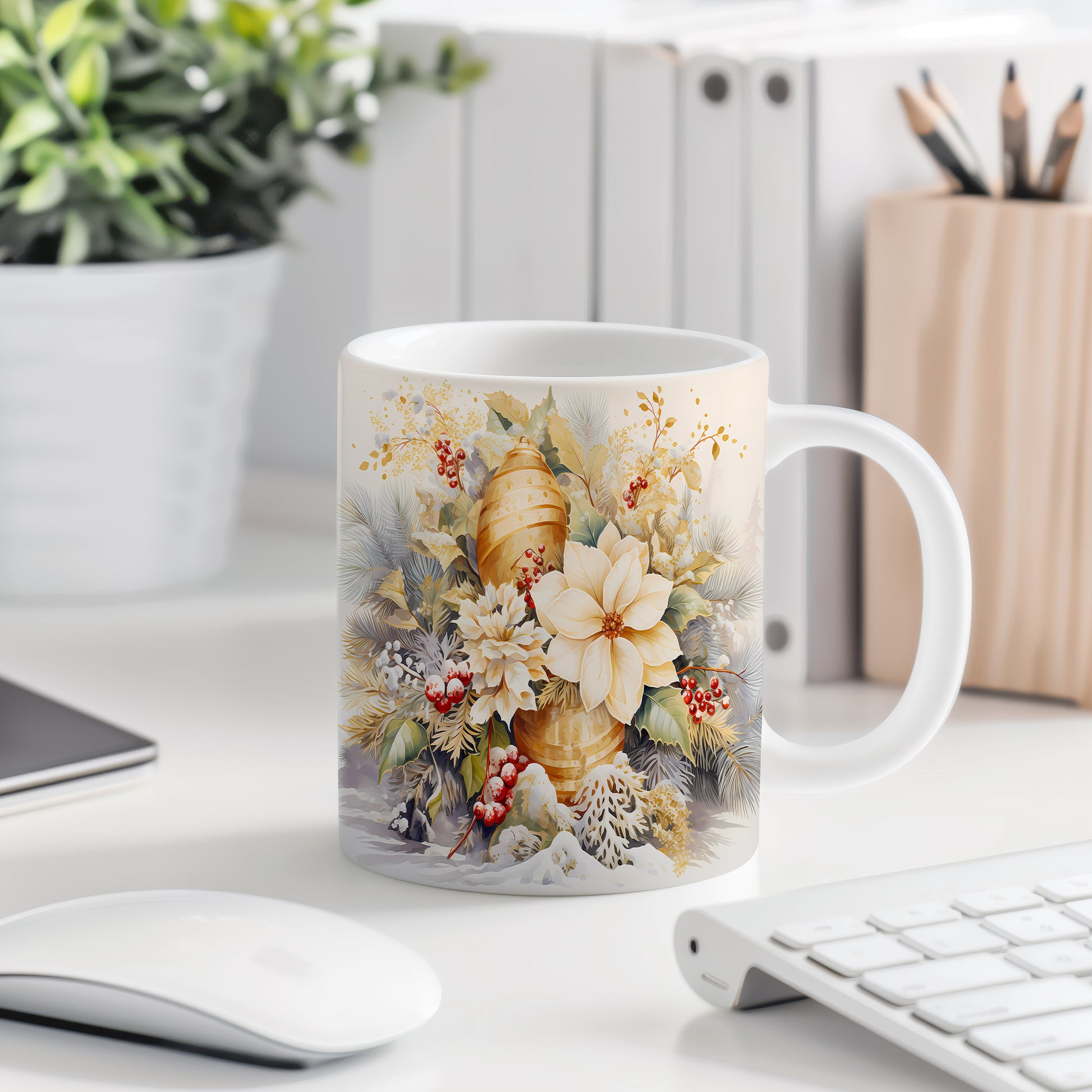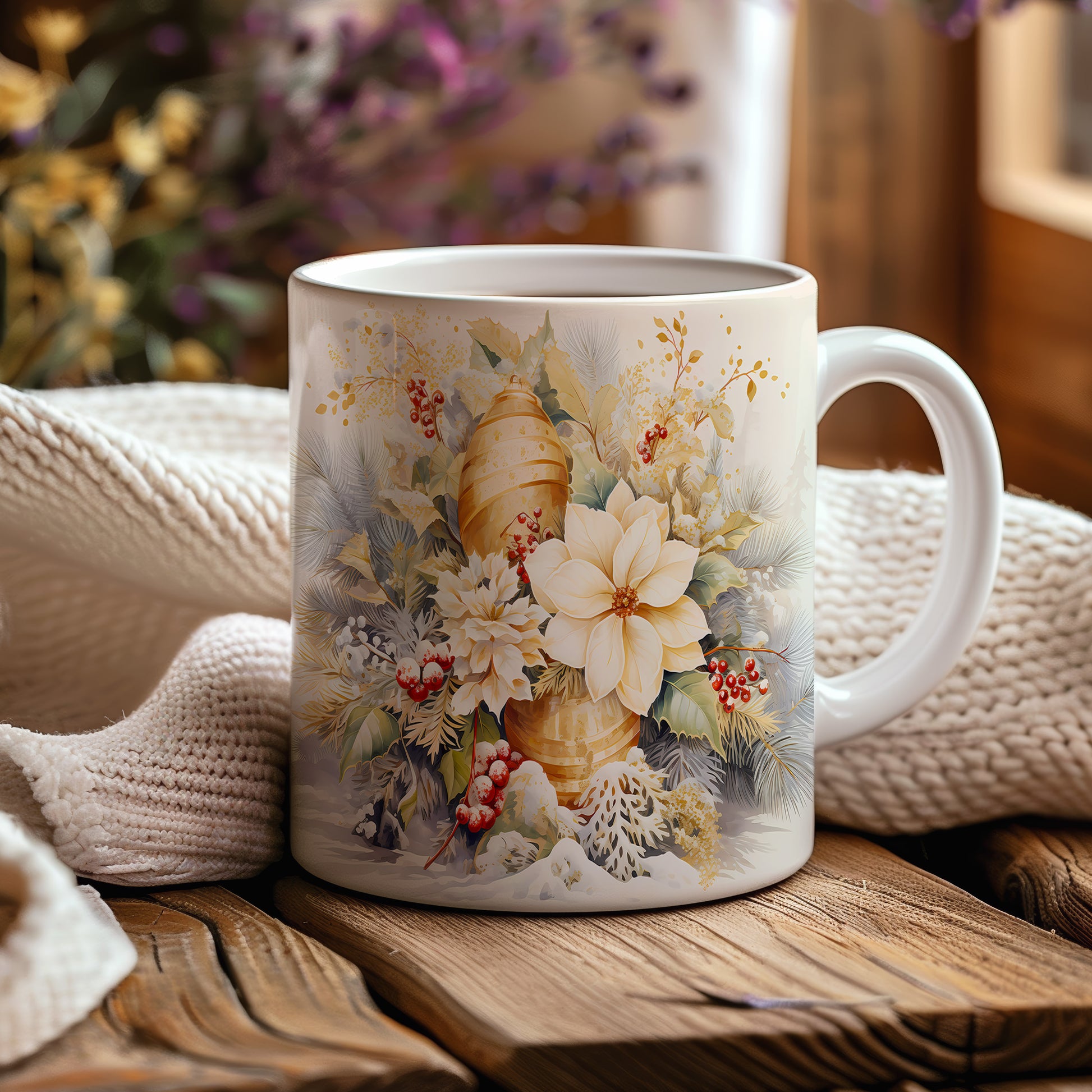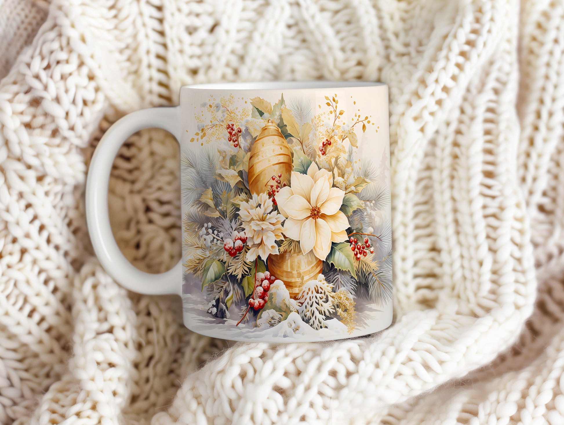 Vánoční hrnek s květinami – ručně ilustrovaný motiv