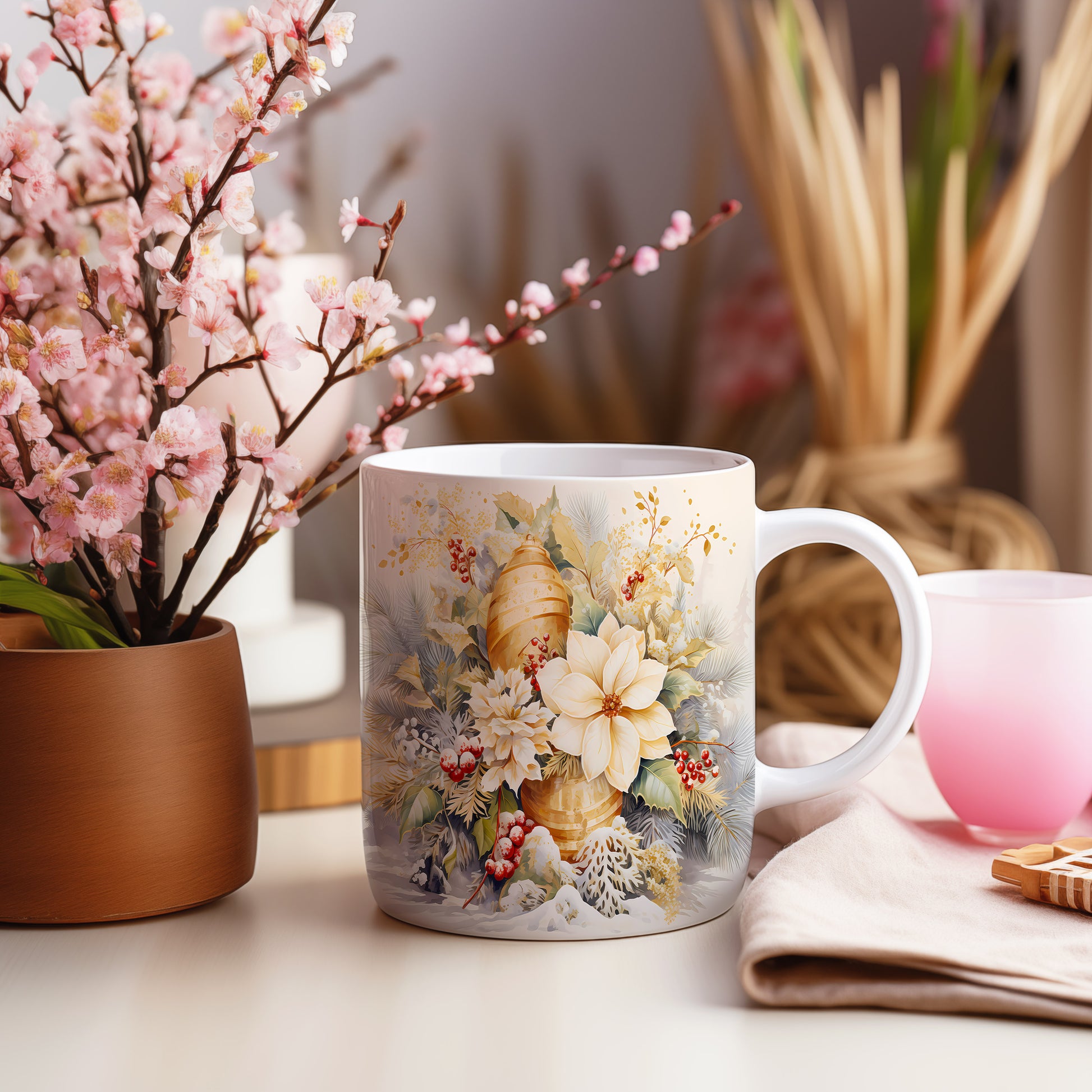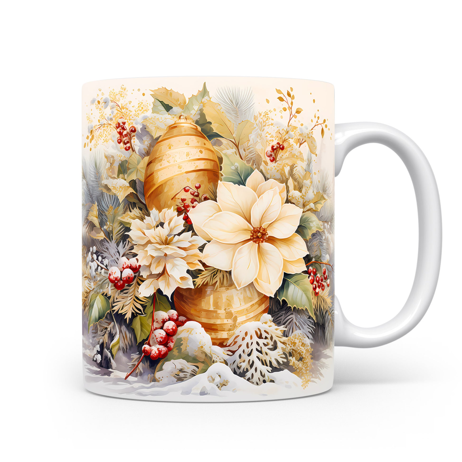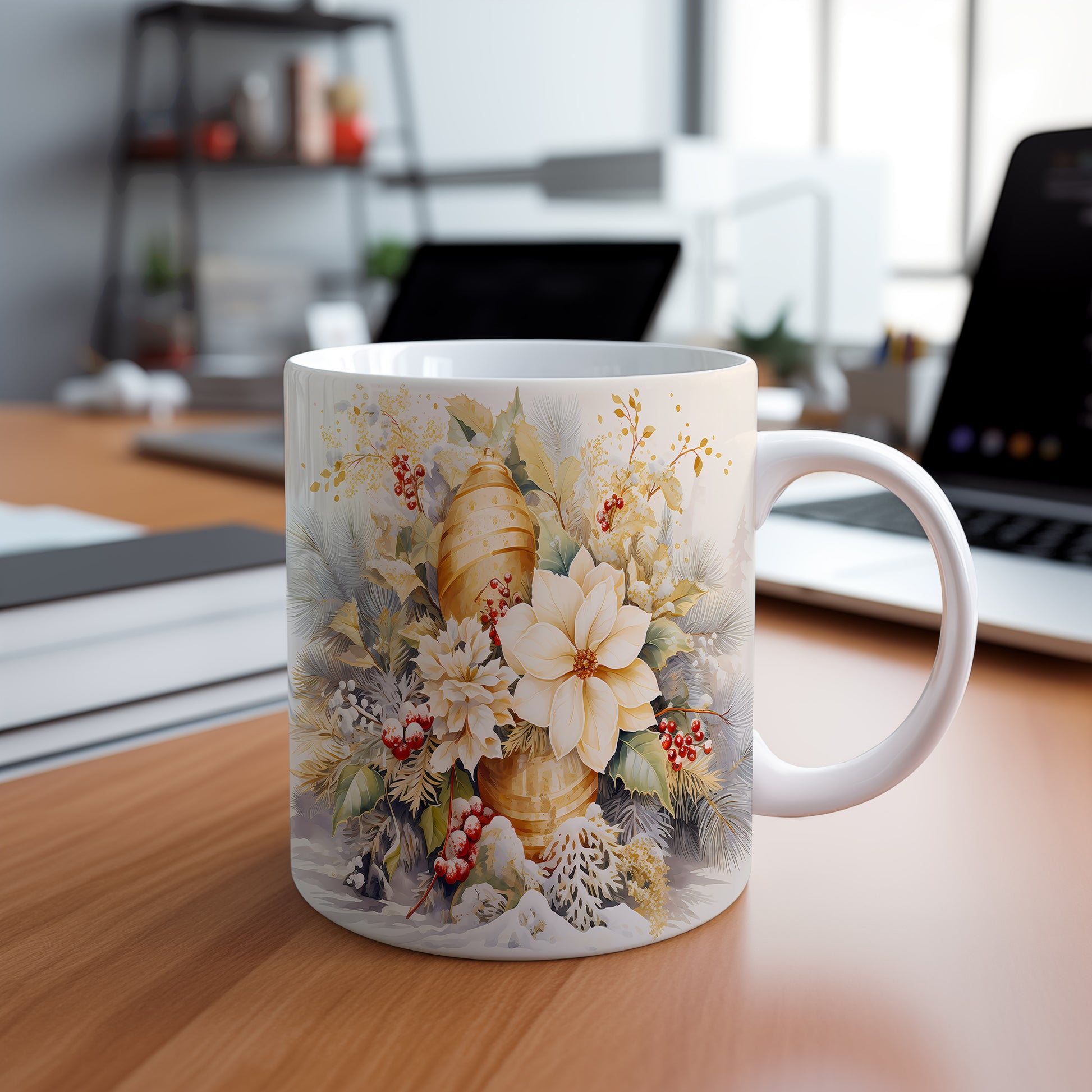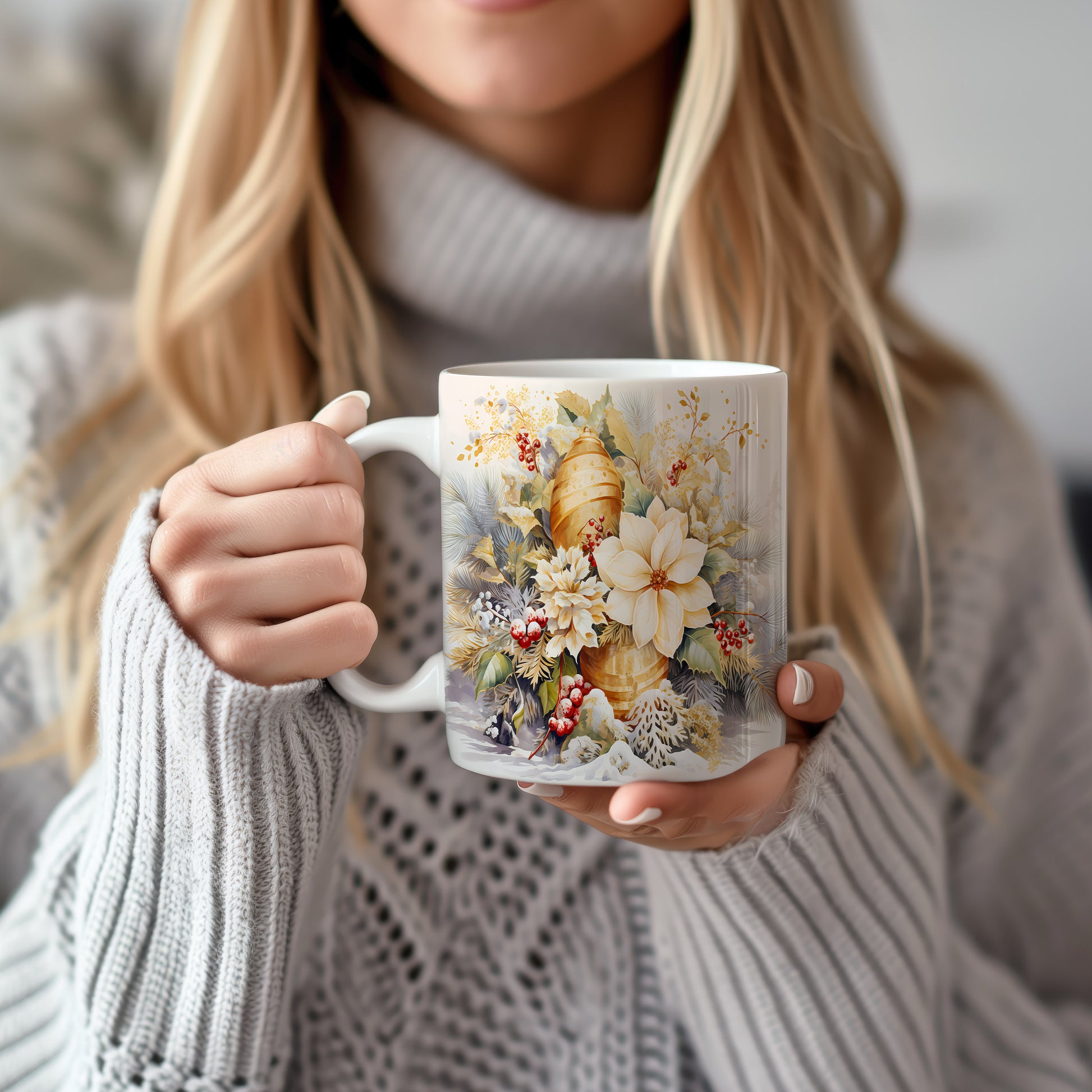 Vánoční hrnek s květinami – ručně ilustrovaný motiv