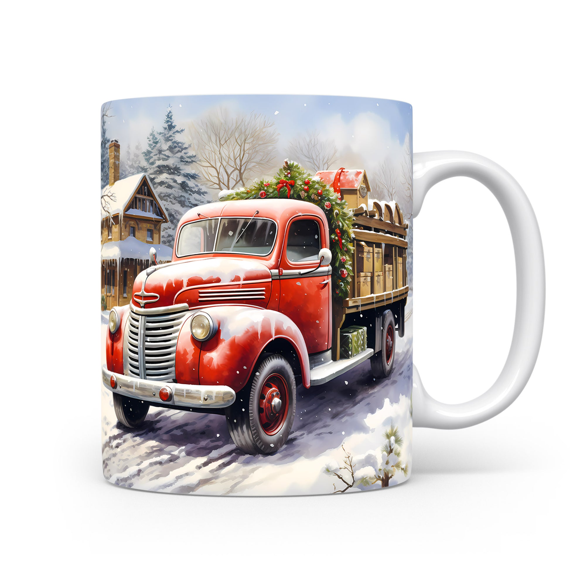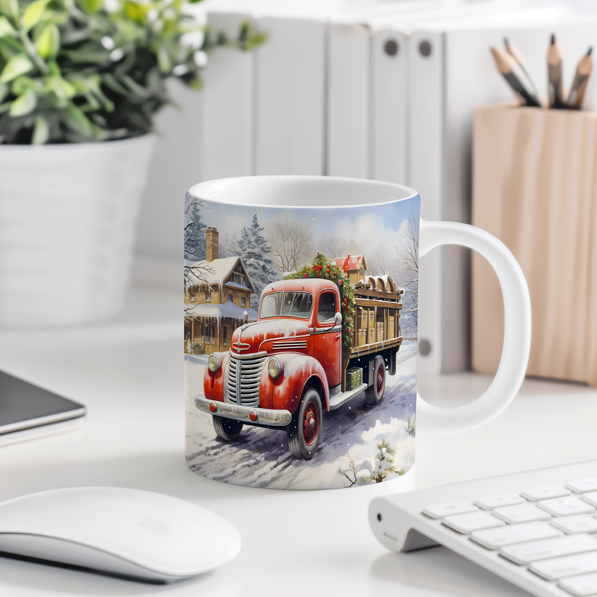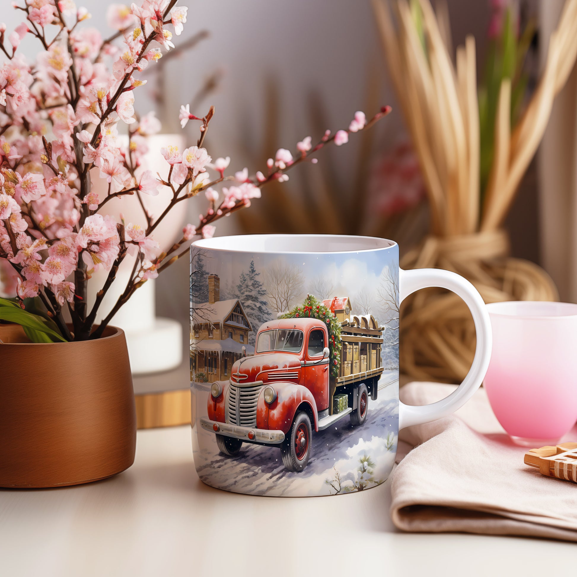 Vánoční hrnek se červeným náklaďákem