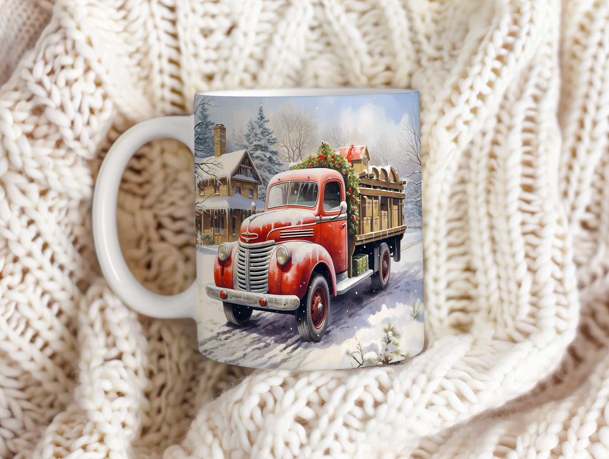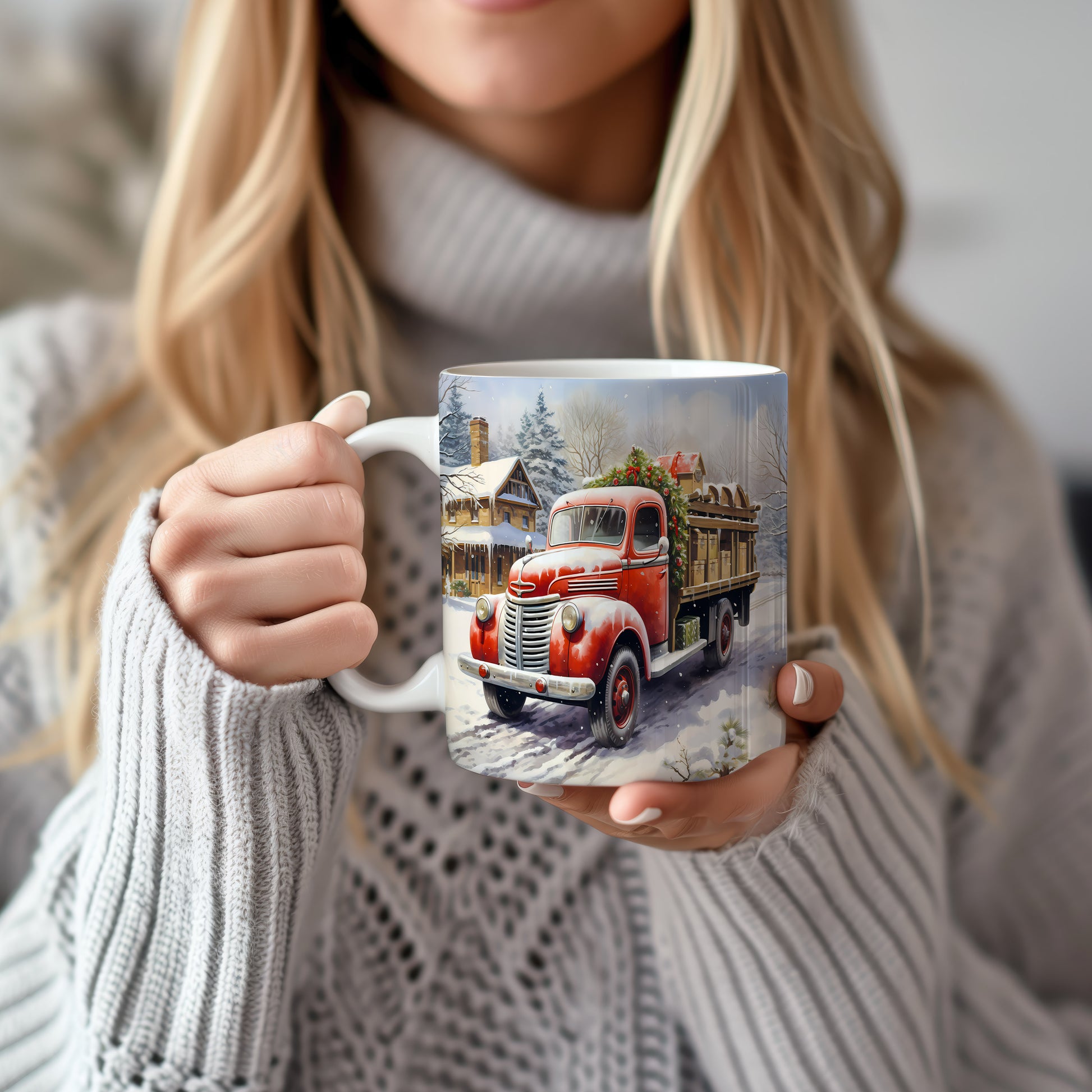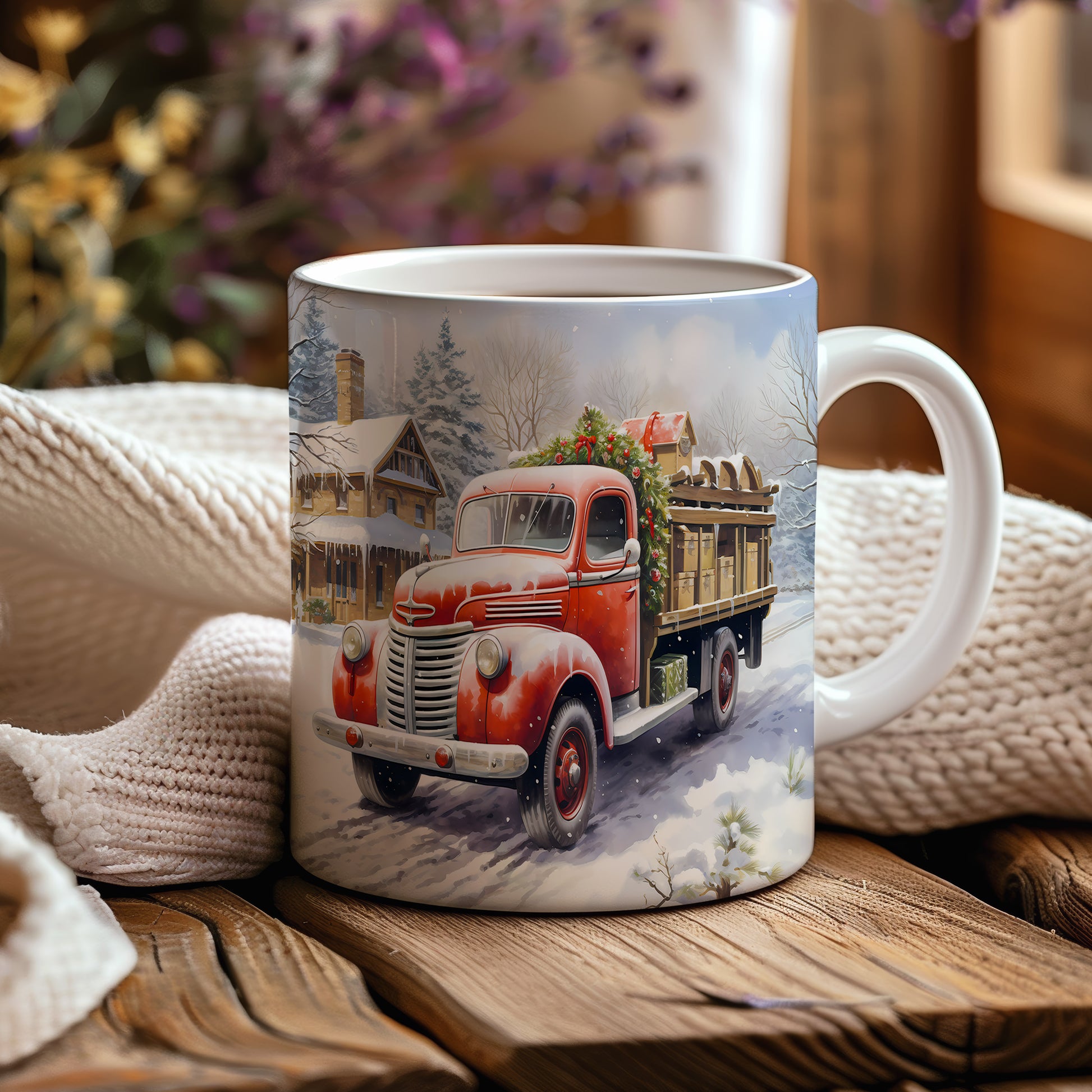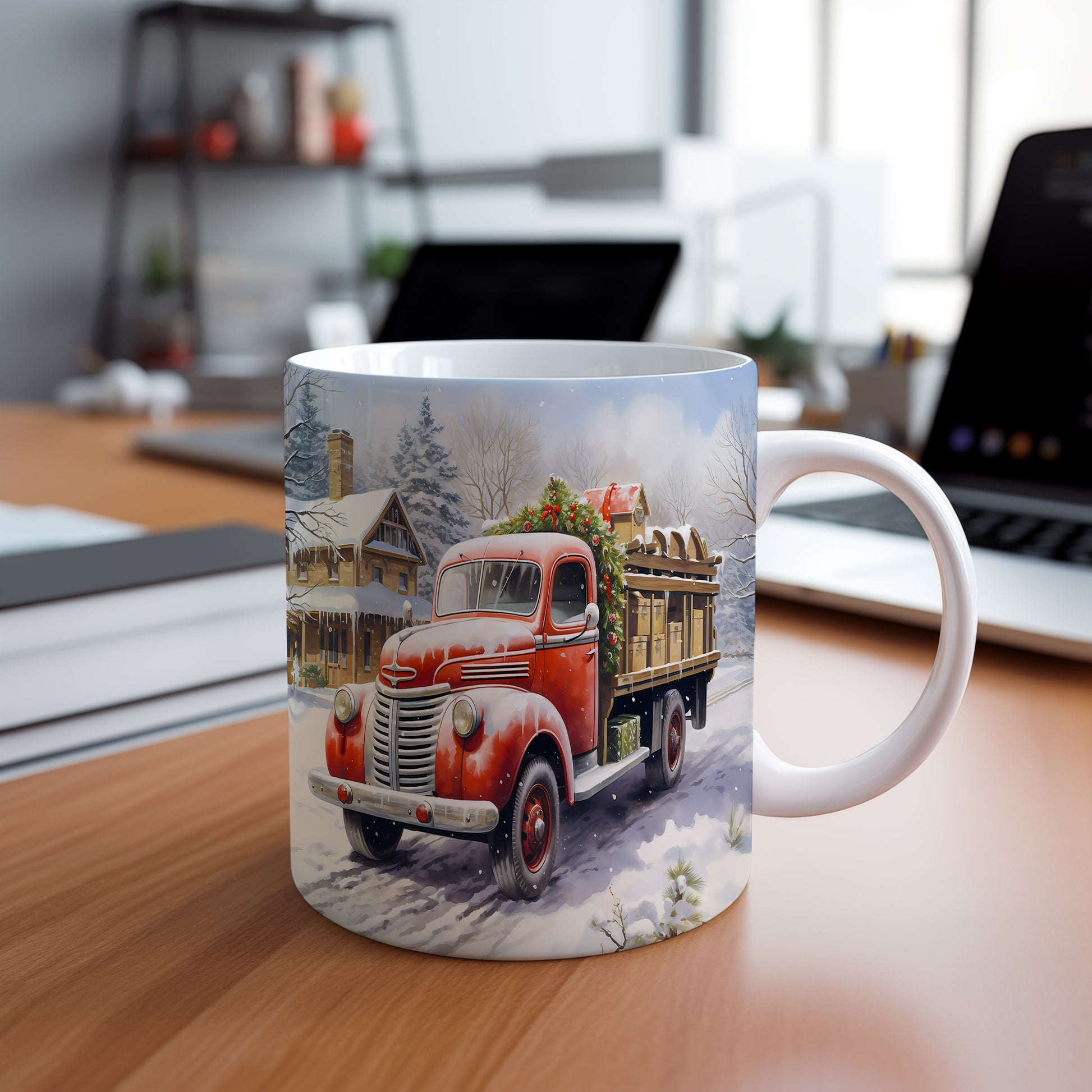 Vánoční hrnek se červeným náklaďákem