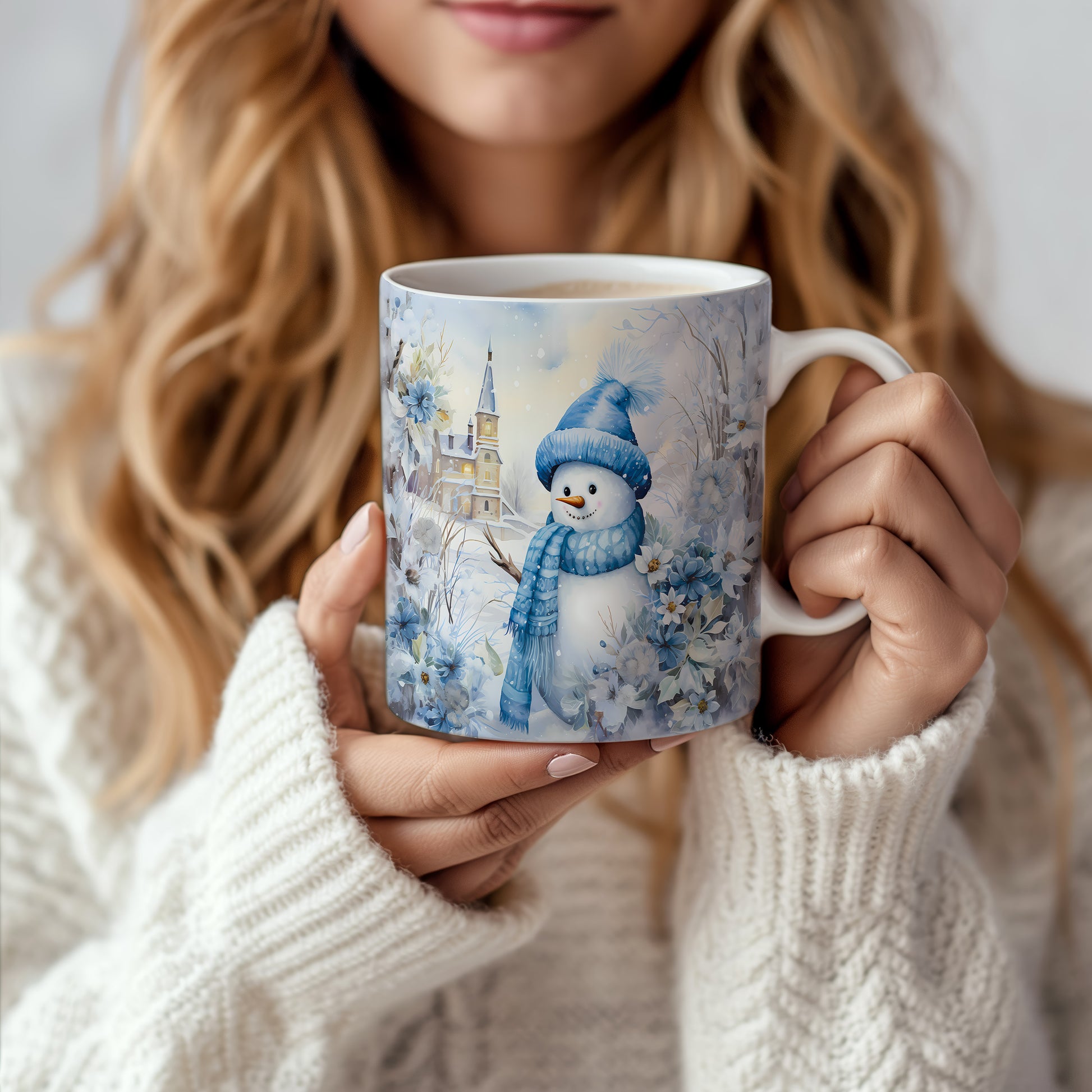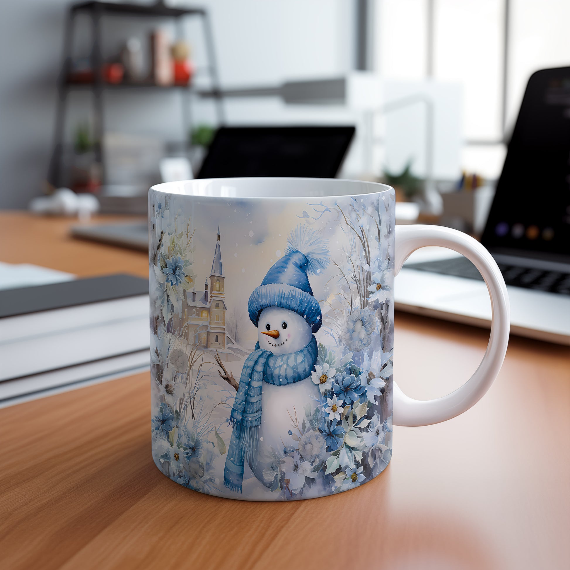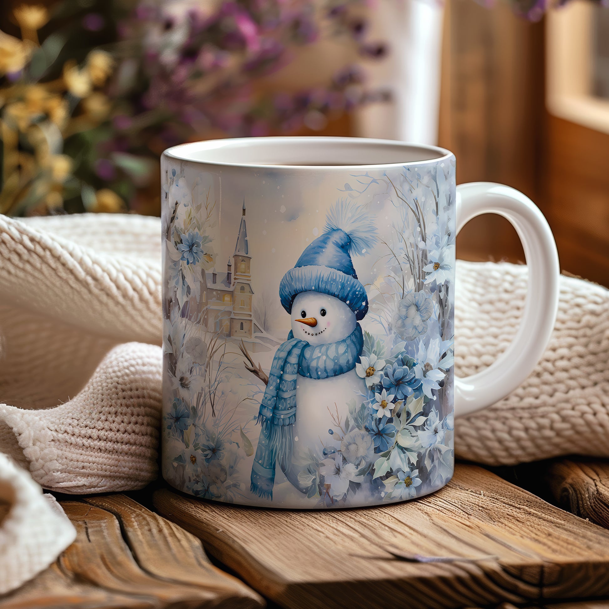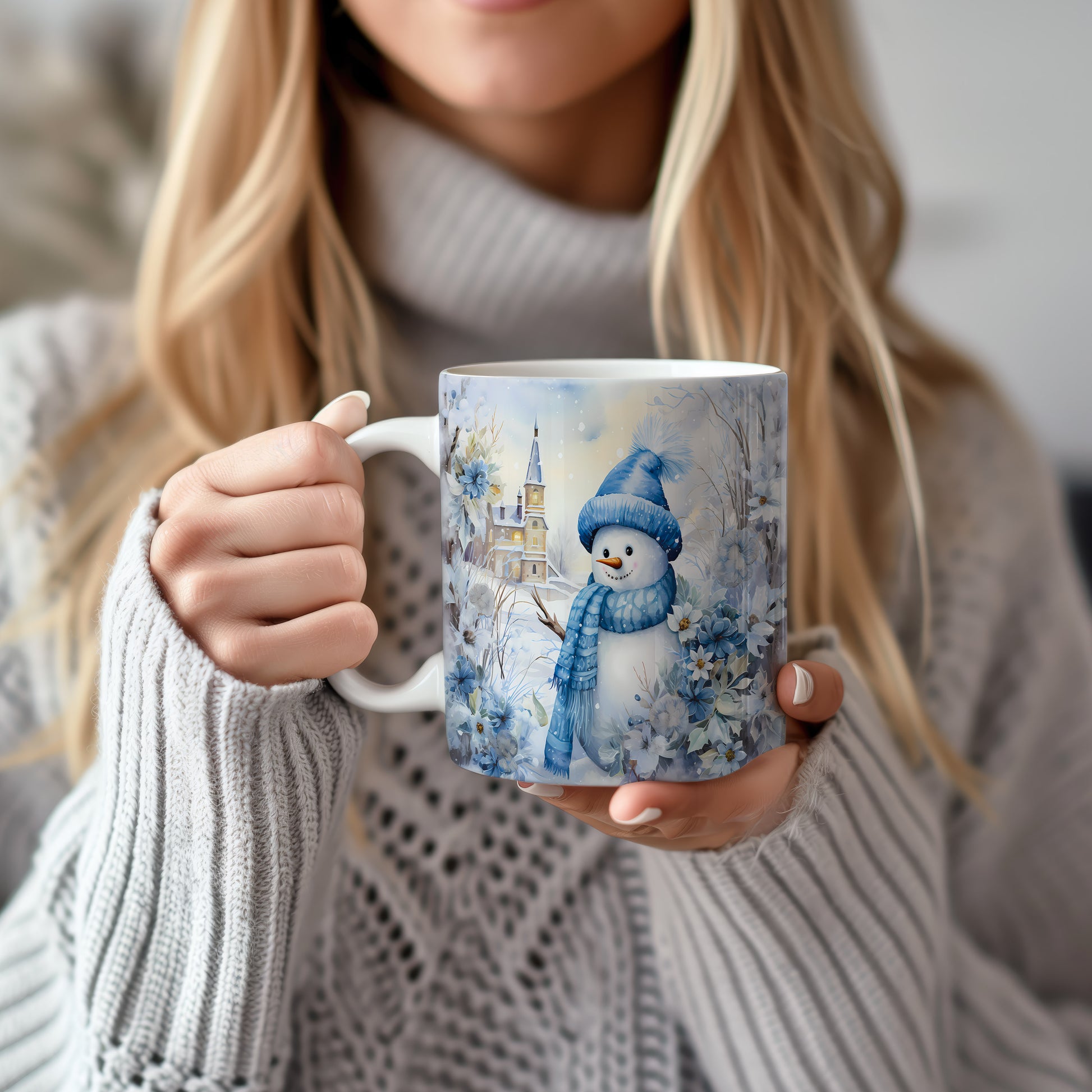 Vánoční hrnek se sněhulákem a šálou – jemná ilustrace