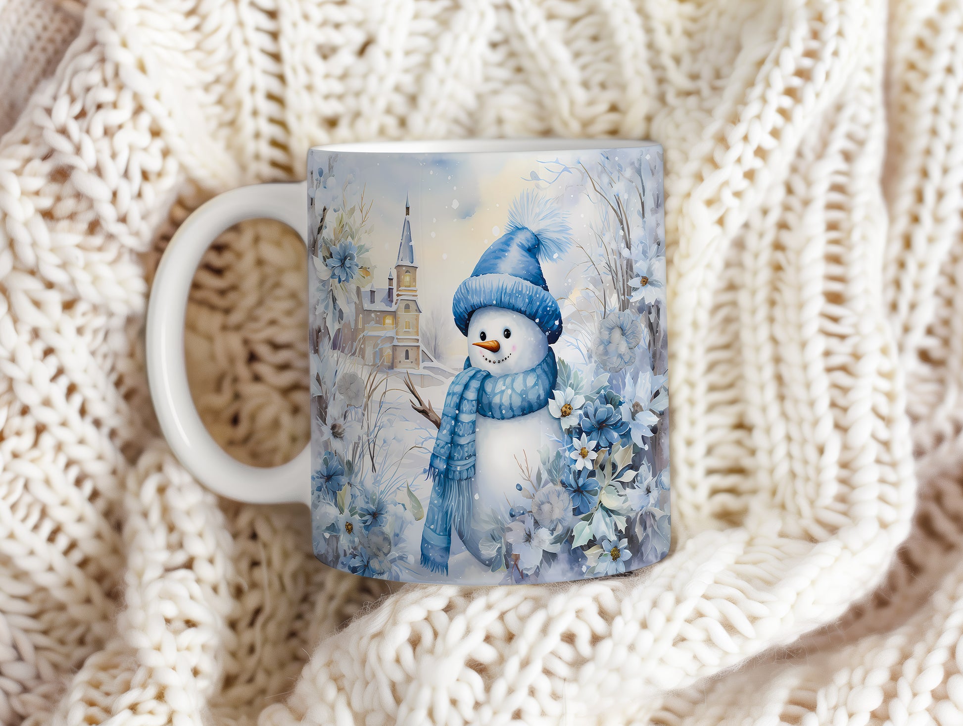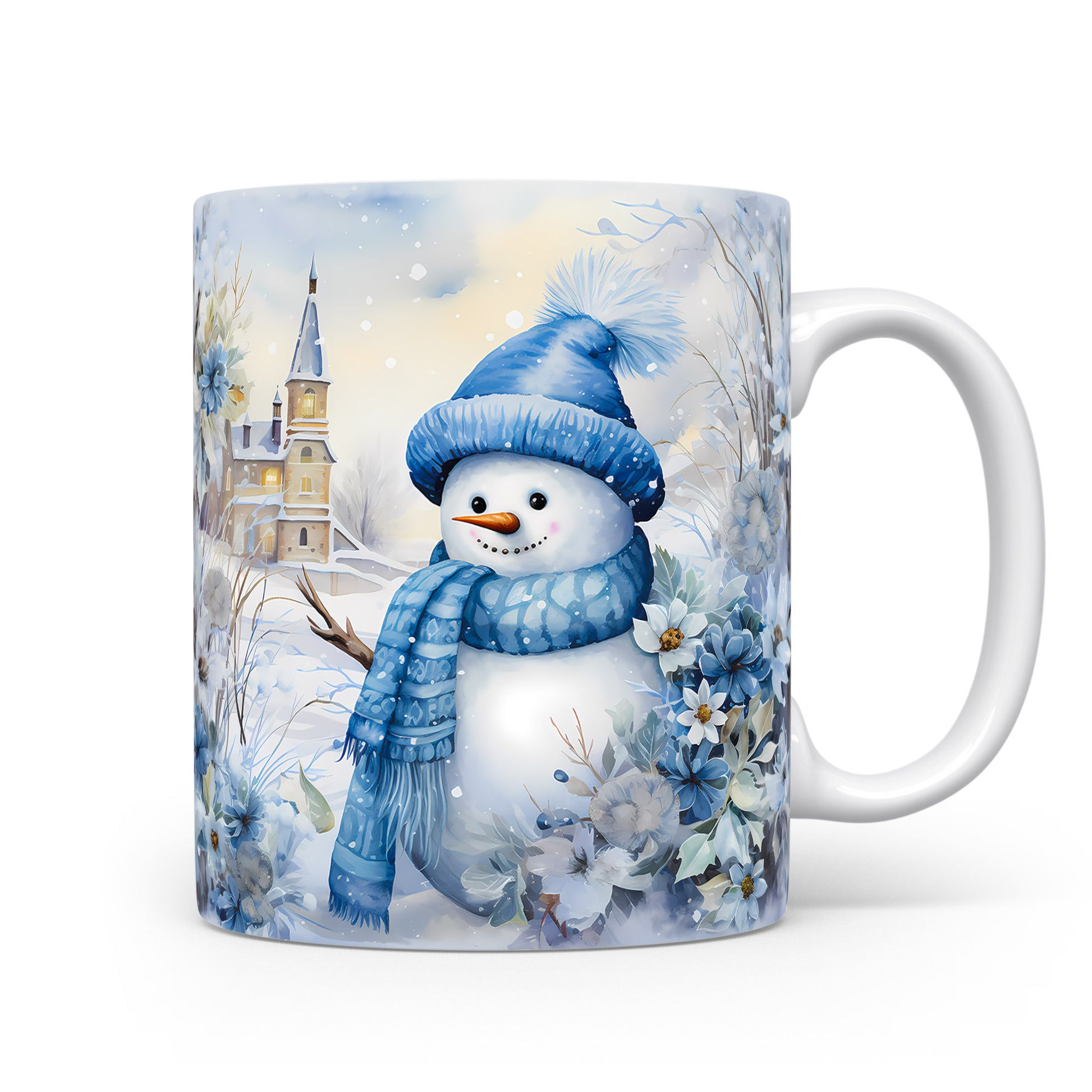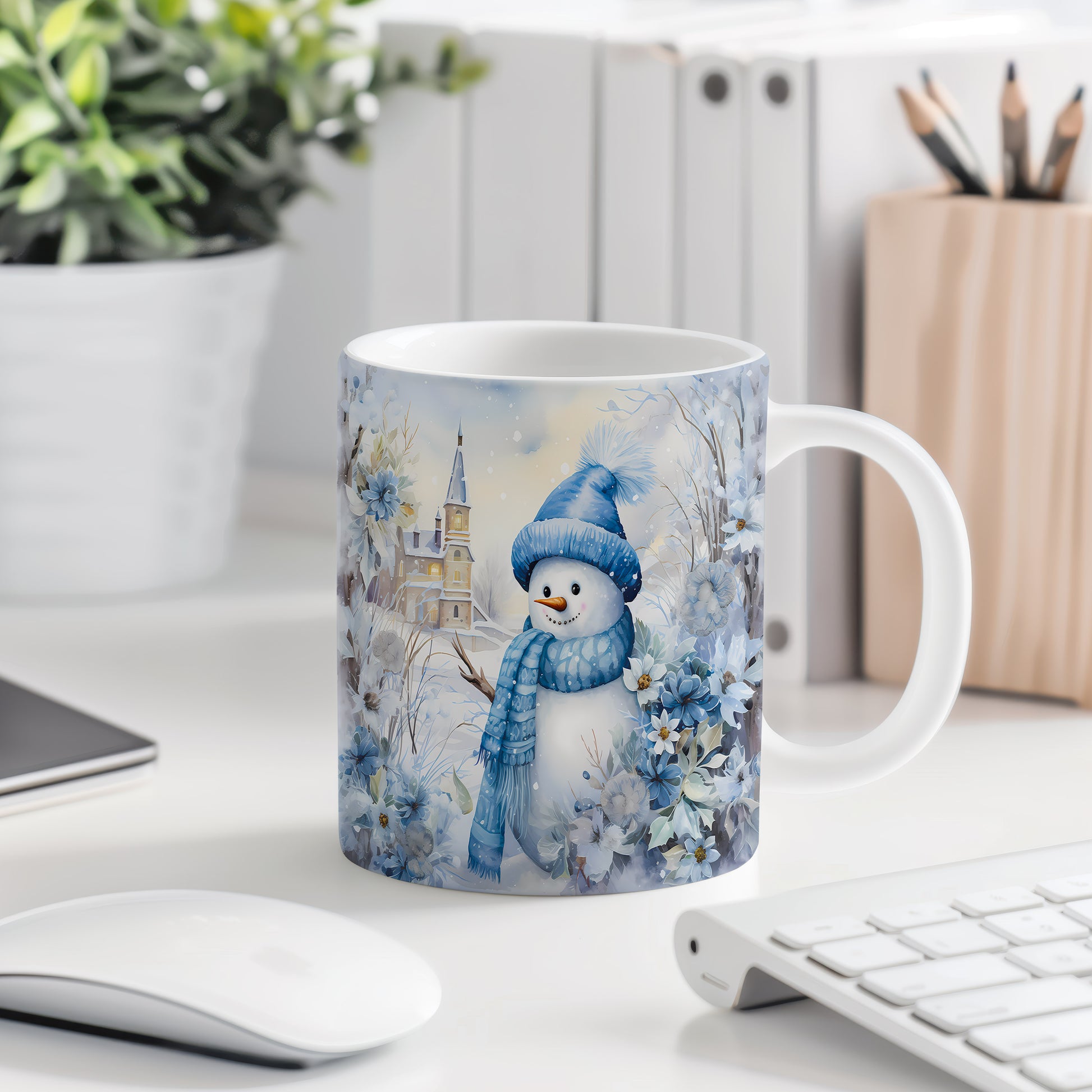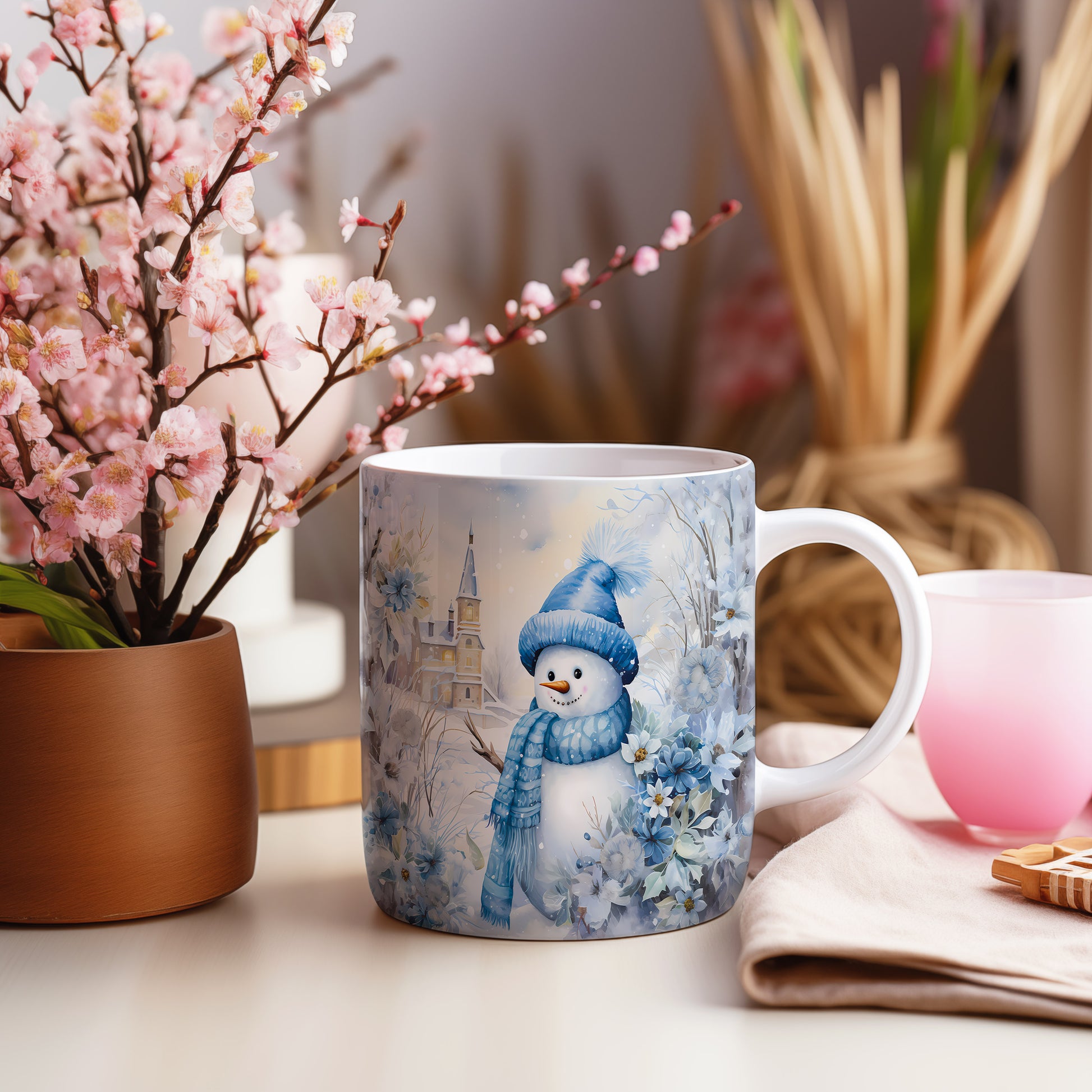 Vánoční hrnek se sněhulákem a šálou – jemná ilustrace
